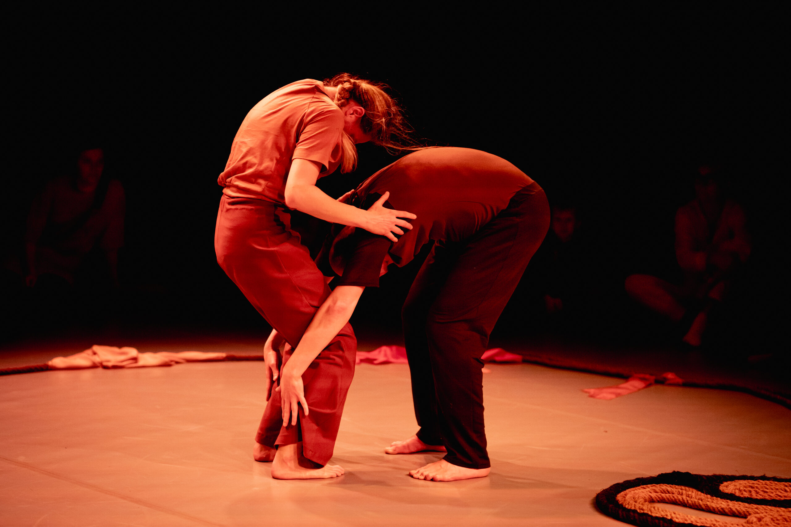 Widownia zostaje zaproszona do zajęcia miejsca na podłodze – tak, by mogła zanurzyć się w obrazach tworzonych przez tańczącą parę. Nie ma słów, są za to ruchy ciała, animacja scenografii i dźwięki, które opowiadają historię narodzin. W drugiej części spektaklu performerka i performer zapraszają publiczność do dołączenia do nich, by we wspólnej zabawie ruchowej odkrywać siebie w działaniu oraz w byciu tu i teraz.